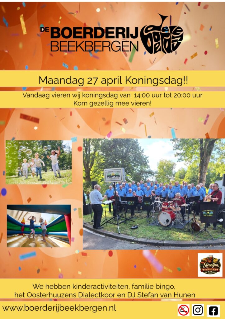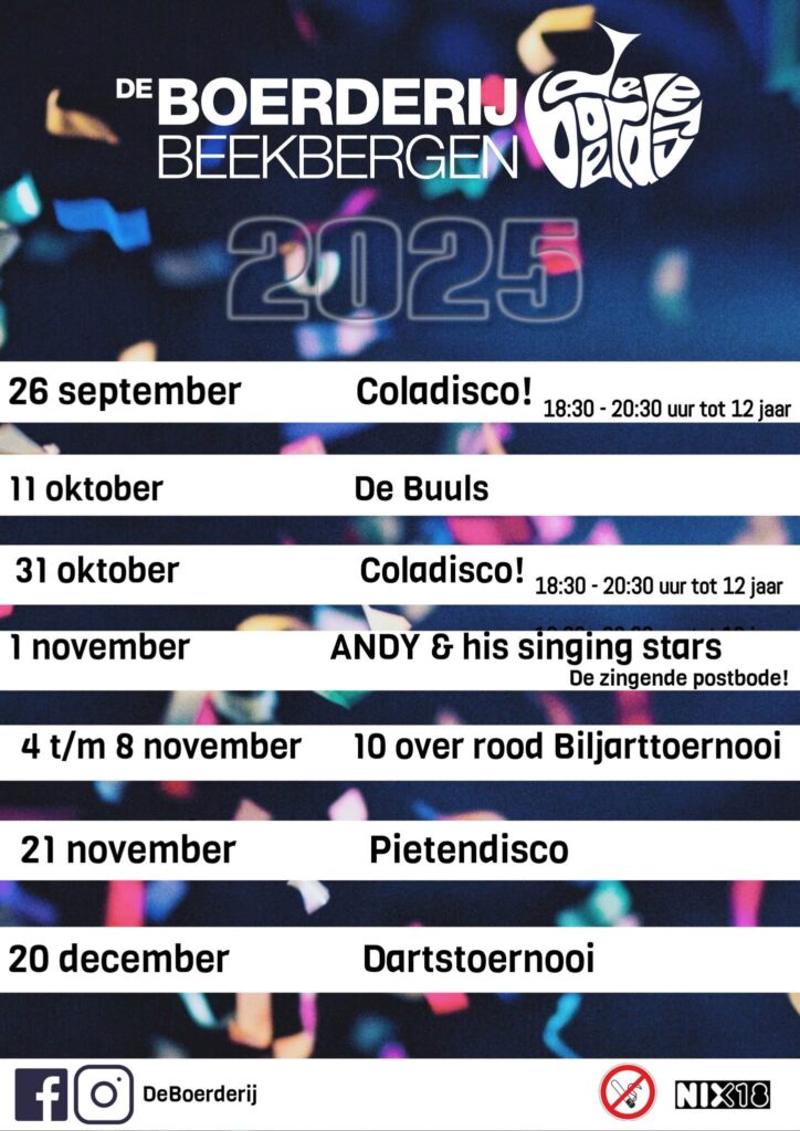 “Vrögger” speelde er bands zoals Normaal en Rowwen Hèze bij de gezelligste discotheek van Beekbergen. Tegenwoordig loopt het niet alleen storm bij de boerenrockbands van deze tijd, zoals Bökkers en de Kisjeskearls. Ook een Ladies Night of Oud en Nieuw feest is binnen een mum van tijd uitverkocht. Een sfeervol Paasvuur, een altijd gezellige Koningsdag inclusief vogelschieten en een Avond4daagse waar ontzettend veel aanmeldingen voor zijn. Ons motto is daarom nog steeds: Wi’j doet ‘t samen!